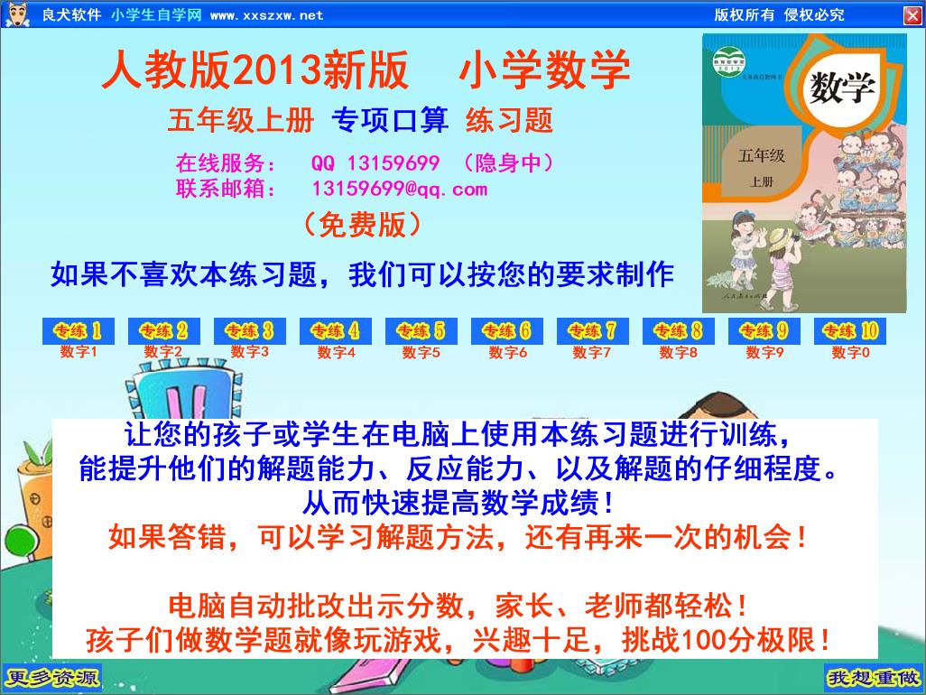 良犬小学数学五年级上册口算练习合集软件是一款小巧便捷的口算练习题软件,可以自由选择口算范围和运算方式,适合小学五年级的小朋友使用,软件包含了小数加减法、小数乘除法等多种类型口算题。