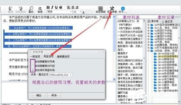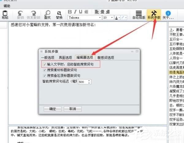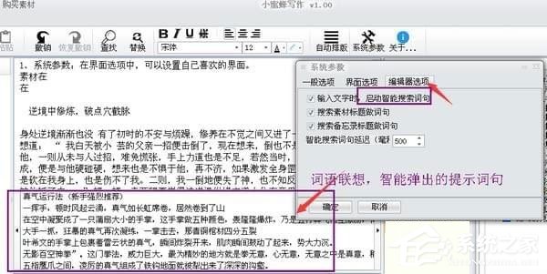 2、系统参数:在编辑器选项中,可以设置智能联想词句的选项。词句的素材包括:词句库、素材库标题和备忘录标题。