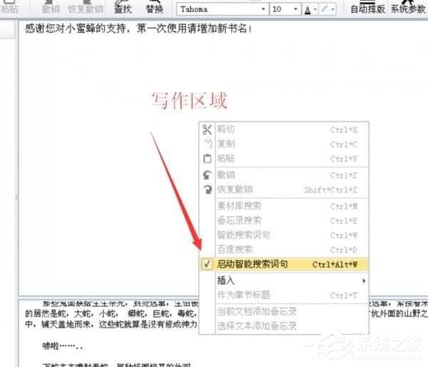 启动方法一:在写作区域,点击鼠标右键,弹出菜单,勾上“启动智能搜索词句”。