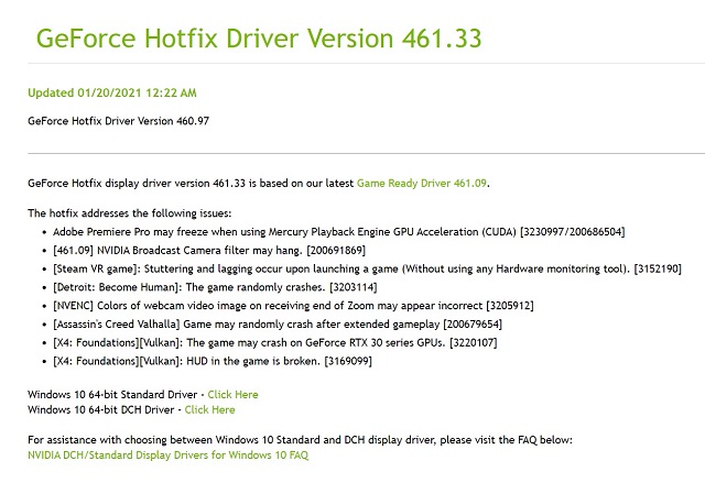 NVIDIA461.33驱动官方版是英伟达方面推出的全新显卡驱动,这款驱动可以让你的n卡驱动始终处于最新状态。此次版本更新修复了pr水银加速的错误,以及玩游戏时造成的错误,用户可以下载进行修复。