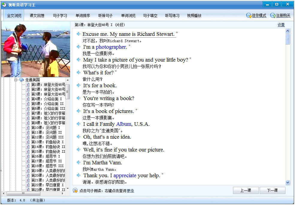 含经典视频教材《走遍美国》全部78集课程、《纵横美国》全部141集课程、《英语900句》视频版全部50集课程和《新概念英语》全套四册(276课)动画视频,所有句子均可即点即读并同步播放视频,通过影像、声音、情景等构造出真实的语境,快速提升您的英语学习效率。