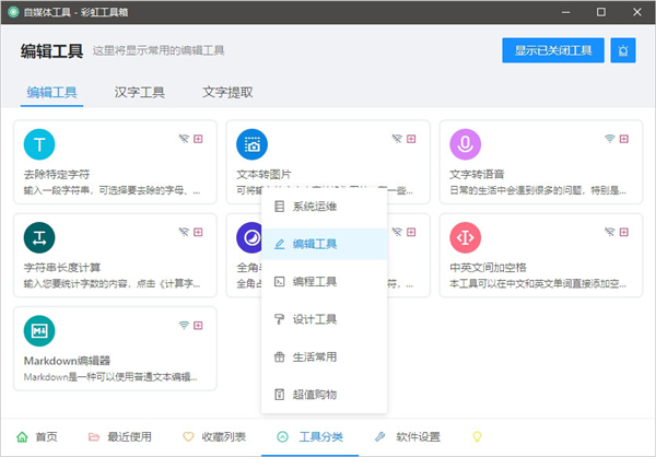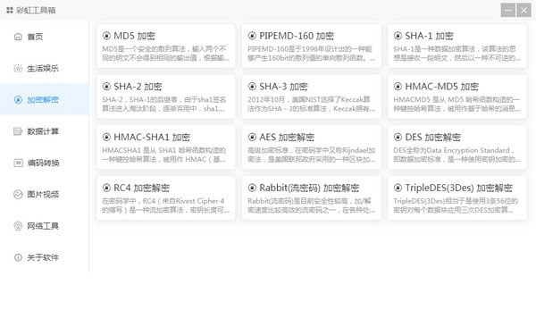 彩虹工具箱提供了大量常用的小工具,并根据小工具的用途分类为 生活娱乐、 加密解密、 数据计算、编码转换、 图片视频、 网络工具等分类。