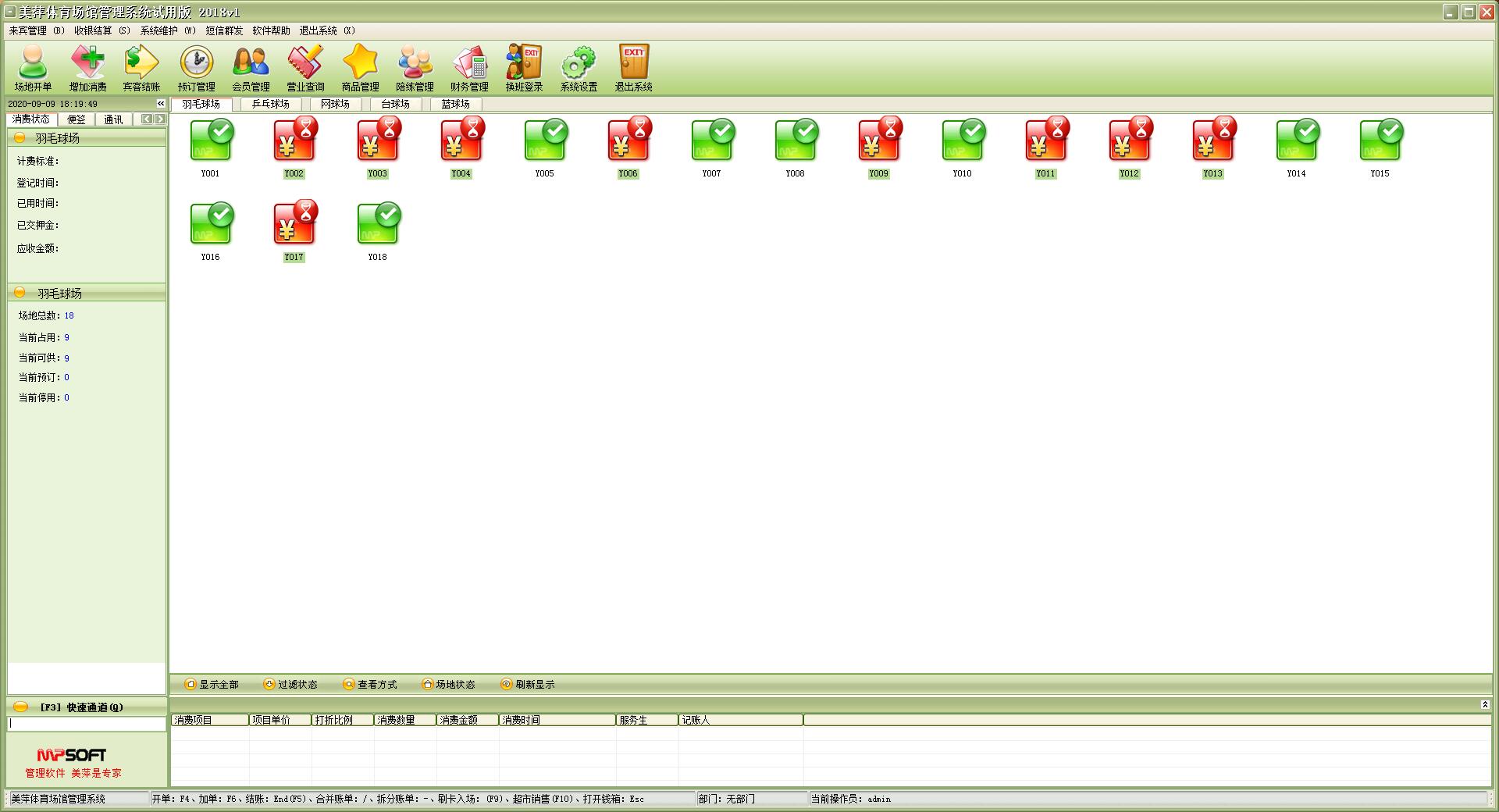 美萍体育场馆管理系统是一款专业的体育馆场地管理系统,球馆管理系统,它集前台收银收费 管理,一卡通功能,场地自动计费管理,场地预订,会员管理,陪练管理等强大功能为一身,系统界面简洁优美,操作直观简单,无需专门培训即可操作使用。是羽毛球馆,乒乓球馆,网球场, 篮球场,台球厅等体育场馆管理信息化理想的管理软件。