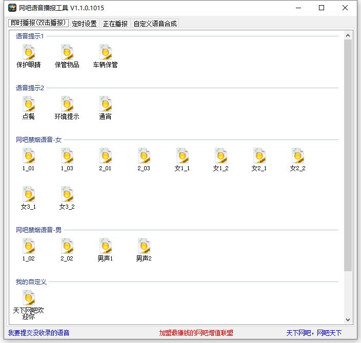 网吧语音播报工具是一款专门用于网吧的语音播报软件,可设置定时播报哪一段,计划任务,还可设置多个定时,提供了不仅有多种语音的提示,还包括点餐提示、通宵提示、禁烟提示等,所有语音文件放在tool目录下,可以自行修改和删除。