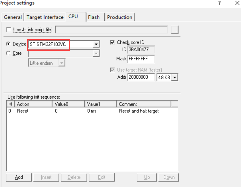 在“CPU”页,选择开发板的CPU型号:ST STM32F103VC,如下图: