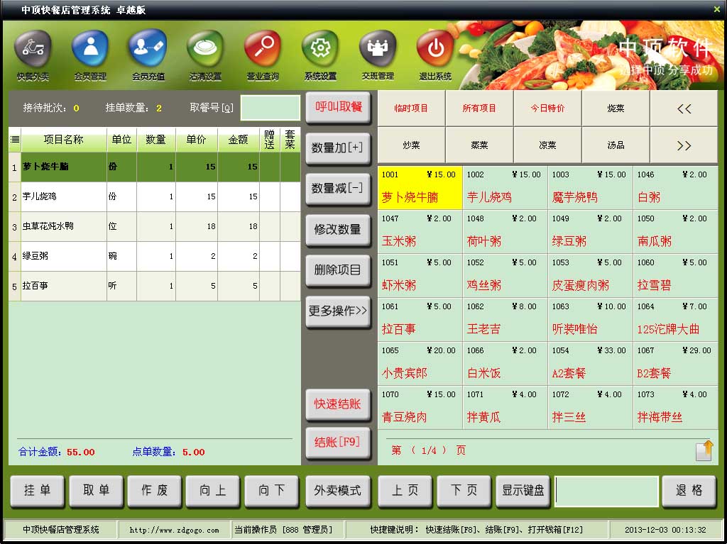 中顶快餐店管理系统是一款餐饮行业管理软件,专门针对快餐进行管理,支持计费、收银、预结、套餐、会员、打折、储值、刷卡等功能,使用方便。