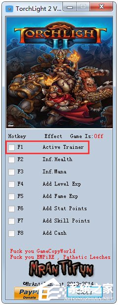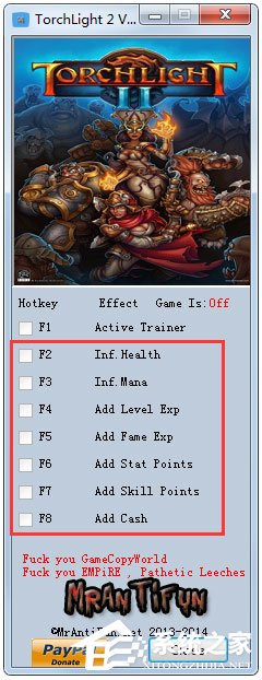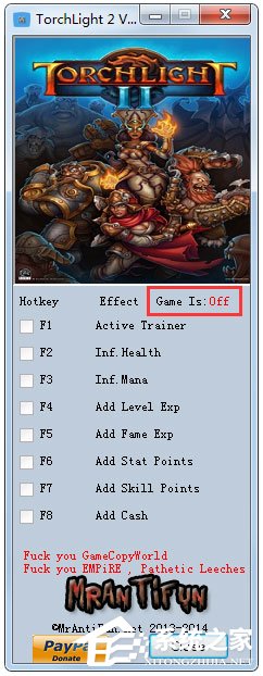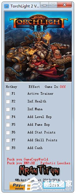 3、双击运行火炬之光2修改器,可以看到修改器界面非常简洁,玩家一目了然;