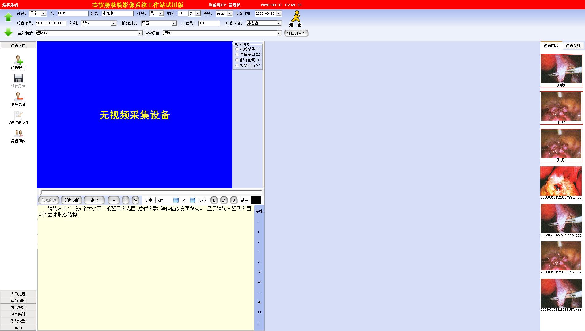 膀胱镜影像系统工作站适用于所有生产厂家和型号的膀胱镜影像设备相链接。批量输入患者信息,能以表格的方式显示病人的相关信息,显示待检病人或已检病人。