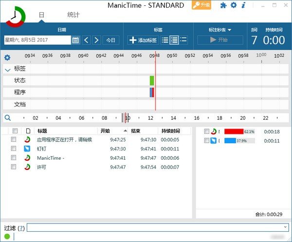 ManicTime是一款专业强大的电脑运行日志记录软件,用户运行过的程序,电脑使用了多久,离开电脑时间多久都可以通过该软件看到,ManicTime还将生成直观的图标供用户查看,方便直接。