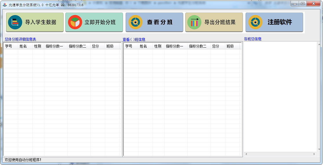 光速学生分班系统是小巧简单的分班系统,适合小学中学新生入学自动分班,能够对班级性别均衡,同时提供两个分数指标进行均衡,分数指标可用,也可以不用。方便快捷,简单易用。