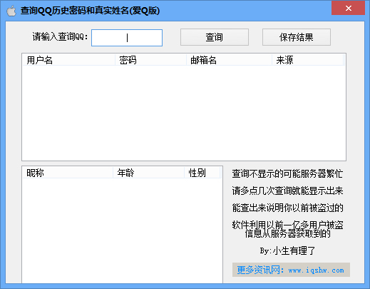 查询QQ历史密码和真实姓名是一款查询QQ用户信息的辅助工具。该款qq用户信息查询软件界面简洁、操作简单,无经验者也能一用即会,用户可快速的查找目标QQ用户的名字、年龄等多种信息,非常方便。喜欢的用户不妨下载试试吧!