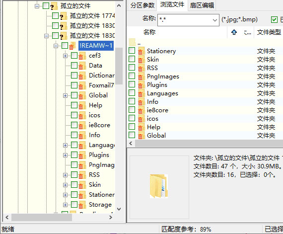 对于不能确定归属的文件及文件夹,程序将它们统一放到一个叫做“孤立的文件”的内存文件夹中。如果在原位置找不到要恢复的文件,可以尝试在“孤立的文件”文件夹中查找文件。恢复后查找文件时不要忘了这个文件夹,很可能要恢复的重要文件就在这里。