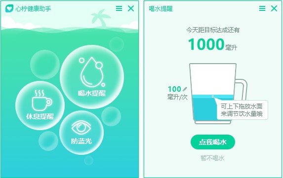 心柠健康助手是一款督促办公族健康的实用小工具,心柠健康助手内含喝水提醒,休息提醒,一键过滤蓝光等功能,上班时保持好的习惯,保护身体健康!