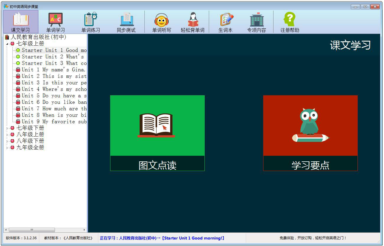 4、软件内容按单元分类,可以同步进行单词、课文等的学习和测试等,测试题可以导出和打印,单词学习可以将错词加入生词本中。