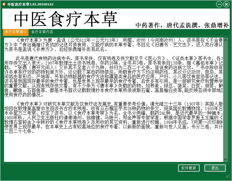中医食疗本草软件包含了上中下卷全本内容,完全支持离线阅读。同时采用大字体文本,方便你的阅读。 《食疗本草》为唐·孟诜(公元612年—公元713年) 所撰。汝州(今河南汝州)人。该书是在《千金要方》中“食治篇增订而成的记述可供食用、又能疗病的本草专著。书目见《旧唐书·艺文志》。近人范行准认为原书是孟诜《补养方》,后经张鼎增补而易此名。