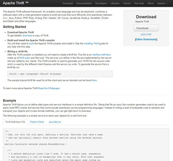 Apache节约软件框架,为可扩展的跨语言服务开发,结合了软件堆栈和代码生成引擎,在C++、java、Python、PHP、Ruby、Erlang、Perl、Haskell、C、Co、Javascript等之间高效地无缝地构建服务。节点.js,Smalltalk,OCaml和Delphi等语言。