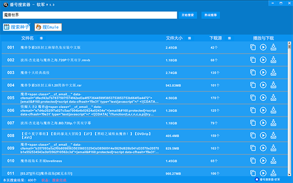 直接输入影片名,演员,热门词,点击搜索即可搜到你想要的资源,支持ed2k,BT磁力链,网站搜索,3种模式,保证能搜到你想要的资源。