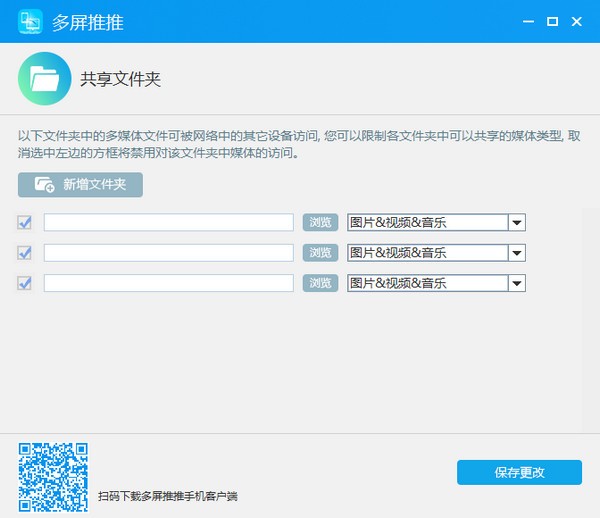 以下文件夹中的多媒体文件可被网络中的其它设备访问,您可以限制各文件夹中可以共享的媒体类型,取消选中左边的方框将禁用对该文件夹中媒体的访问。