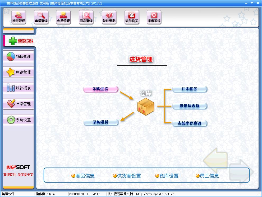 美萍食品销售管理系统是一款专为食品销售行业打造的管理软件,软件界面设计简洁,美观,软件流程人性化,具有强大而实用的库存管理、财务管理和收银员工管理等功能,让庞大的人员系统变得简单,广泛适用于商场,食品,门店等用于食品进销存管理。