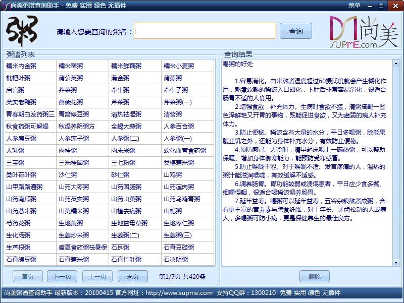 尚美粥谱查询助手是一款免费、实用、绿色、无插件的粥谱查询软件,如果你不会做粥,本软件包含多种粥类做法,一步一步教你学会做粥,解决温饱,女人拴住男人心必备秘密武器之一。