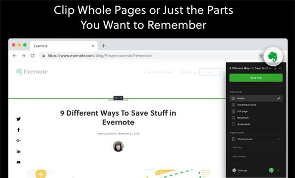 安装完毕后,点击chrome浏览器工具栏中的插件图标,打开Evernote Web Clipper,选择剪藏类型,你可以保存网页正文、整个页面或选中部分。