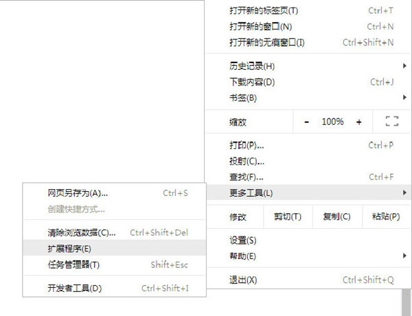 1、打开chrome内核浏览器,选择右上角设置 - 更多工具 - 扩展程序;
