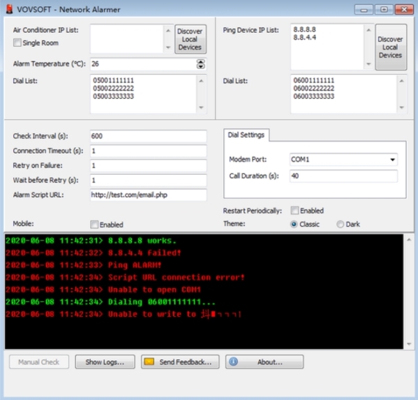 网络报警器也能够检查空调机的状态,通过用户自定义IP,同时支持多个设备。你甚至可以设置一个温度水平过去的应用应该给你一个电话或一封电子邮件。同样的,你可以添加其他的IP地址ping设备IP列表和本会验证他们是否在线或不通知你结果通过时间戳的通知在窗口的下半部分。