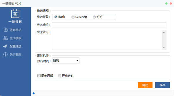 全自动一键签到绿色版可以让用户快速签到,无需进入网站及程序就可以签到了,可以自定义设置用户的个人需求,可以手动添加需要的网页,通过输入登录链接、请求模式及绑定返回语句等内容,即可完成操作,支持推送设置等功能,是非常实用的,操作起来也很方便。