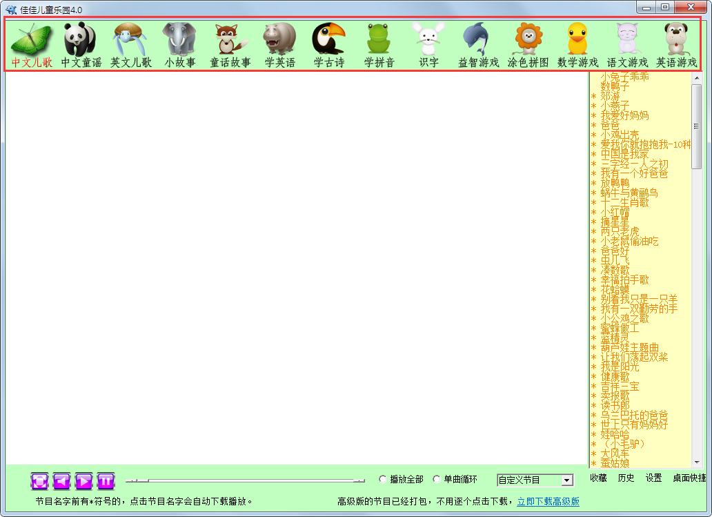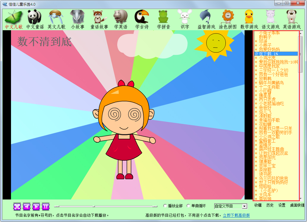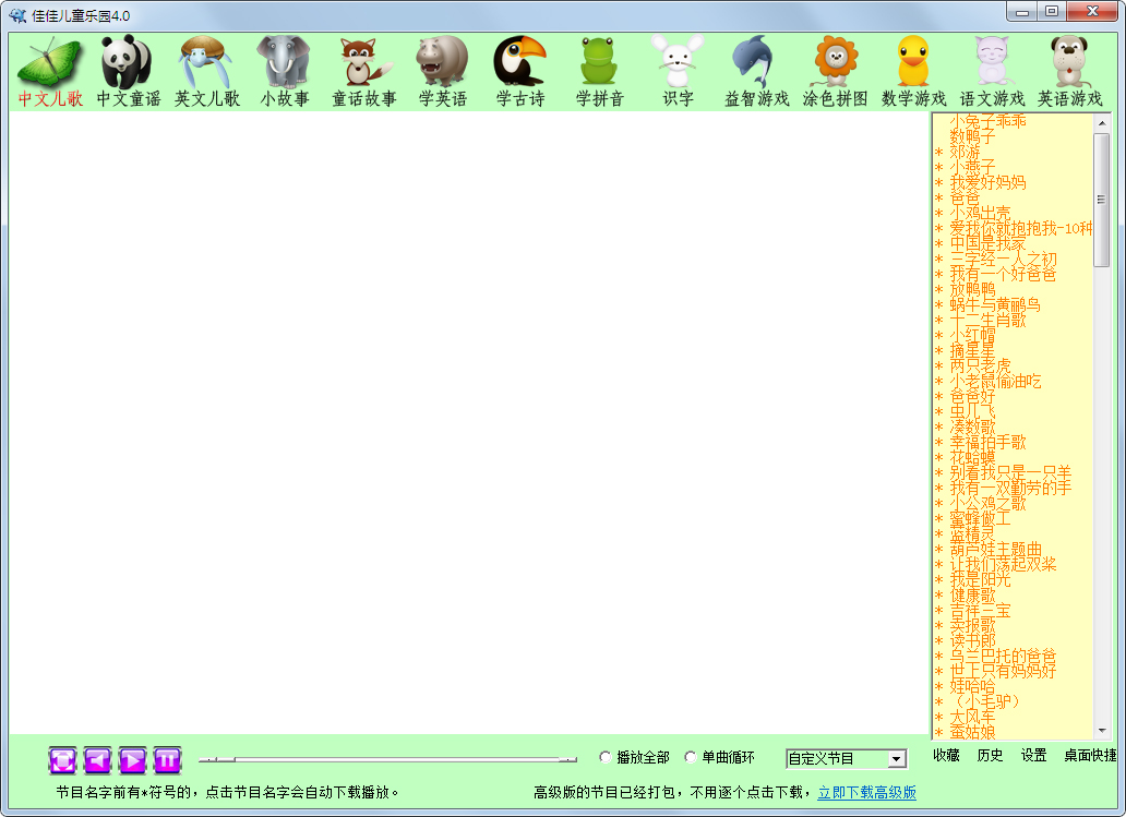 1、在小故事,成语故事,童话故事,中文儿歌,中文童谣,英文儿歌单元中,既有充满神奇浪漫色彩的神话传说、民间故事;也有开拓心智的童话、寓言、幽默故事以及朗朗上口的经典儿歌、歌曲。而且,都是经过精心剪裁提炼的、世界故事宝库中最脍灸人口的名篇佳作,其中所表达的对真、善、美必胜的乐观信念,对假、恶、丑的嘲讽和无情鞭挞,对于开拓智力,陶冶性情,锻炼意志,完善精神,都会有很大的帮助。这些故事和儿歌是滋润小朋友心田的雨露和甘泉。