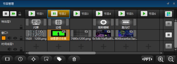 通过对节目管理中的窗口进行编辑,可以生成对应的节目,进而实现节目流程的切换,使LED大屏显示不同效果。节目列表和节目图层可以无限添加:窗口里面可以播放包括视频、图片、字幕、音频等内容,特效图层可以添加各种特效,流程标签层标记更多流程可以让节目更明确细致。另外右下角的PPT全局翻页,可在软件任意界面控制PPT的播放,方便快捷。