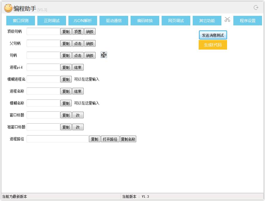 滑稽编程助手支持窗口探测、正则调试、json解析、驱动加载以及编码转换等功能,软件拥有自动更新功能,通过微云笔记+蓝奏云取直链实现!