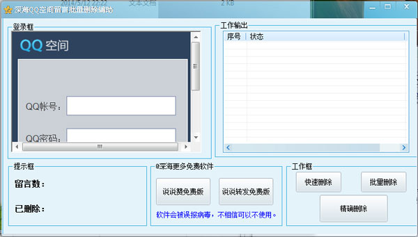 由于有些人气高的空间留言过多手动删除很浪费时间,可以使用这款深海QQ空间留言批量删除辅助,一键秒删空间留言,该QQ空间留言批量删除软件使用方便,操作简单,无需验证码即可轻松登陆,删除1000留言只需1分钟。