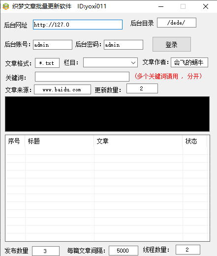 织梦文章批量更新软件是一款非常好用的文章批量更新工具,这款软件是由易语言发开的。这款软件采用常规的网站文章更新模板,可以批量添加文本,操作也是相对简单,需要的可以来下载。
