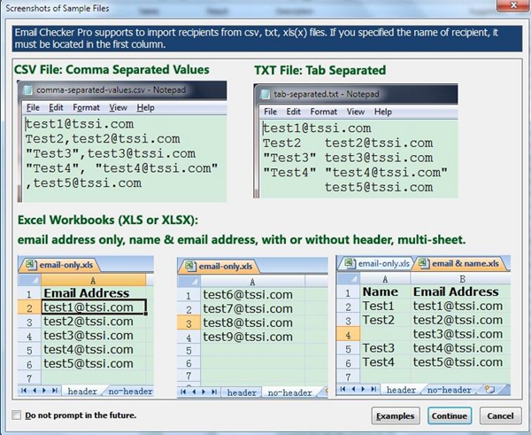 它非常易于使用:只需从csv(逗号分隔值),txt(制表符分隔)或Excel工作簿(.xls或xlsx)导入电子邮件地址,然后单击《检查》按钮,结果将很快显示。您还可以将结果导出到csv / txt / xls / xlxs文件。