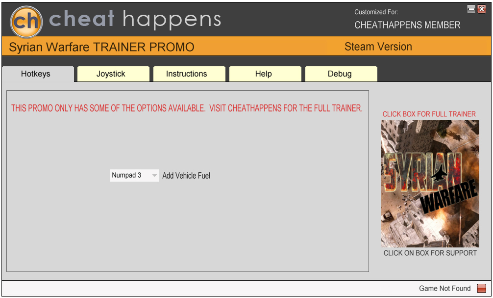 叙利亚战争修改器是一款针对《叙利亚战争》所推出的游戏作弊器。这款叙利亚战争修改器可进行巨型步兵单位、无限弹药、添加车辆燃料等5项操作辅助,让你更轻松玩游戏!