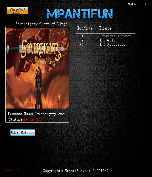 主权王冠两项修改器,可获得无限金,无限资源这两项实用功能,需要的可以来看下哦。