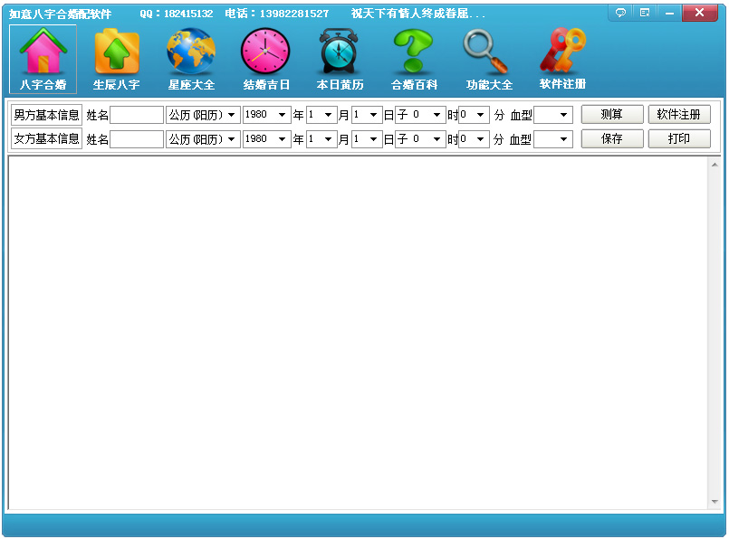 软件另外根据双方基本信息推算订婚和结婚吉日,软件还提供生辰八字详细分析、星座详细分析、民俗预测、数字吉祥、缘分测试大全等功能;软件主要测算内容都可以打印及保存。