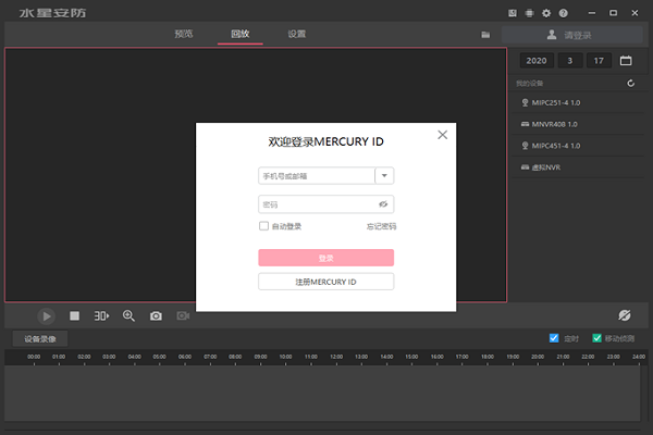 电脑客户端上点击右上角【请登录】,并登录摄像头或录像机上绑定的MERCURY ID。