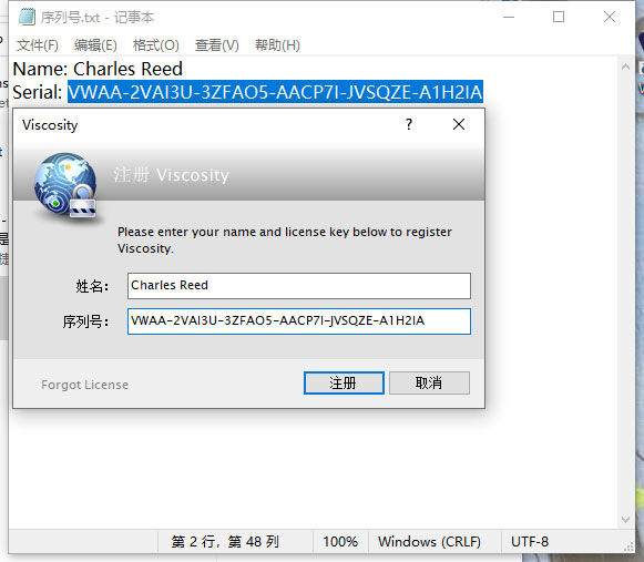 4、将"序列号"文本中的注册信息复制到软件内,点击注册;